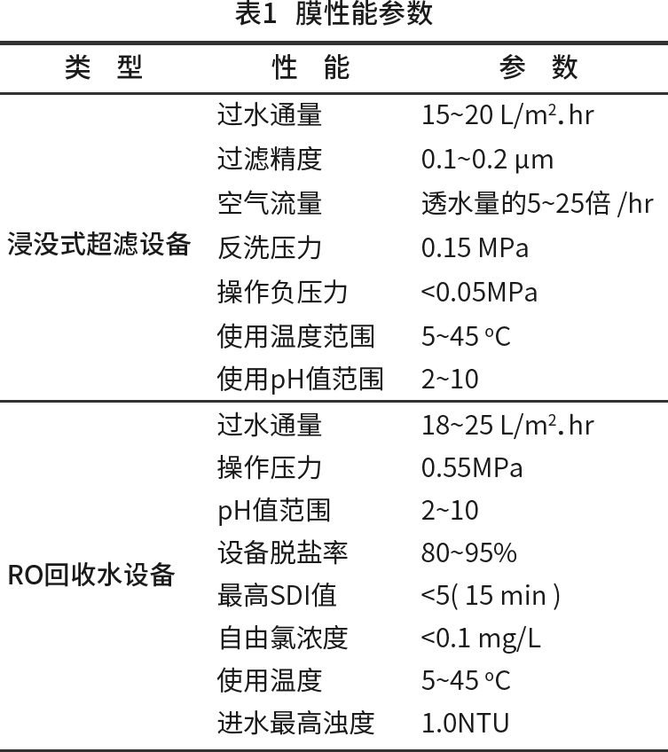 某印染公司的印染廢水中水回用工程由2個系統(tǒng)組成:一是新建了20000 m3/d的物化、生化處理系統(tǒng),使印染廢水COD濃度降到100~200 mg/L;二是配套建成了8000m3/d廢水深度處理的膜處理系統(tǒng),利用“雙膜法”技術(shù)再對印染廢水進(jìn)行深度處理之后,全部回用于生產(chǎn)中,本工程采用的膜性能參數(shù)詳見表1。該工程處理污水量20000 m3/d,其中回用8000 m3/d,占地面積20000m2,建筑面積3000m2。