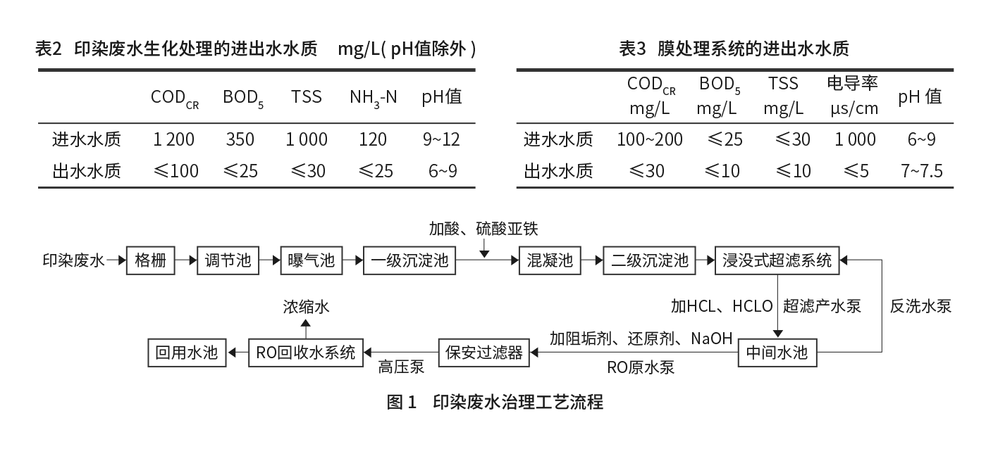 針對印染廢水屬于典型的工業(yè)有機廢水這一特性和可生化性較差并含有難以降解的水溶性有機污染物、SS、膠體狀物質(zhì)等特點,采用了“雙膜法”處理工藝,不僅可以回收水資源,實現(xiàn)廢水循環(huán)回用,而且還可以進(jìn)一步削減排污總量。
